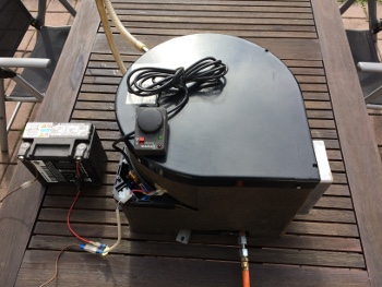 Bild zeigt überholten Truma-Boiler Bj. 1993/94 bei der Endprüfung der Funktion. Nachdem der vorherige Zustand nicht klar war erfolgte diese mit Wasserfüllung, weil nur so die Temperaturregelung und das zugehörige Schaltverhalten prüfbar ist. Bei diesem Boiler musste zudem noch die Steuerplatine von einer Spezialistin geprüft und instandgesetzt werden, da ein Fehler in der Flammüberwachung vorlag und dieser immer nach 5-10sec auf Störung ging. Die meisten Fehler in der Steuerung behebe ich zwischenzeitlich selbst, weil mit den zwischenzeitlich gemachten Erfahrungen geht das deutlich schneller und preisgünstiger....