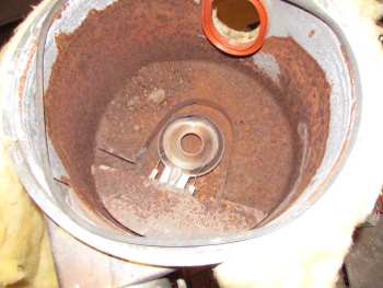 Hier das Innenleben eines Truma-Boilers, der über 30 Jahre in Betrieb war. Eine Kaminabdeckung war nicht vorhanden und so kam es zu starker Rostbildung mit Durchrostung des Gehäuses. Auch der Brenner ist defekt, weil eingerissen. Ausgebaut wurde der Boiler wegen Defekt an der Steuerung, da dieser nicht mehr angesprungen ist.
