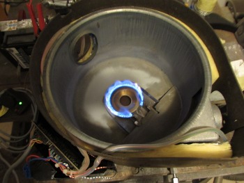 Hier ein seltener Truma-Boiler in Sonderausführung von einem Dethleffs-Alkovenmobil Bj. 89, für den es heute natürlich keinen Ersatz mehr gibt, nach erfolgreicher Überholung bei der ersten Brennprobe. Boiler wurde vorher kpl. gereinigt, alle elektrischen Umfänge, sowie Gasteile überprüft und ein Fehler in der Steuerung behoben. Ein Rostansatz im Brennraum wurde dabei auch gleich beseitigt.