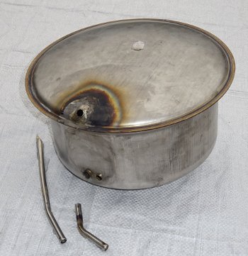 Bild zeigt den Wasserkessel eines Truma-Boiler B10 Bj. 1991. Bei Anlieferung war der obere Stutzen undicht und es wurde auch schon ein Lötversuch unternommen. Bei der Vorbereitung für eine fachgerechte Verbindung des Stutzen mit dem Kessel ist dann noch der untere herausgebrochen, weil werksseitig auch diese schlecht ausgeführt war. Wenn solche Stellen undicht werden kann dieses zu unbemerktem Feuchtigkeitseintrag im Bereich der Bodenplatte eines Wohnmobils führen und langfristig zu grossen Folgeschäden....