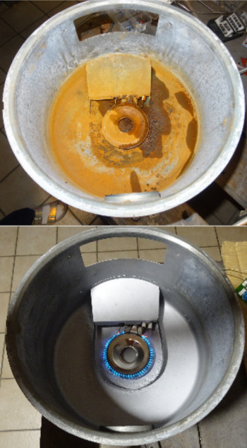 Der obere Teil des Bildes zeigt das Gehäuse eines Truma-Boilers im Anlieferzustand. Dieser hatte einen “Wasserschaden”, verursacht durch fehlende Ablaufmöglichkeit für von aussen eindringendes Wasser in den Brennraum, weil z.B. das Rohr vom Kondenzwasserablauf verstopft war und auch eine Kaminabdeckung fehlte. In der Folge wurde der Windschutz vom Brenner durch Korrosion vollständig zerstört, die Korrosionsprodukte hatten sich am Brenner abgelagert und leider auch das Gasventil unbrauchbar gemacht. Bei der Aufbereitung hat sich dann auch noch eine punktuelle Durchrostung am Kesselgehäuse herausgestellt. Der untere Teil des Bildes zeigt den Boiler bei der ersten Brennprobe nach der Überholung. Der Brenner konnte gereinigt werden und der Windschutz wurde nachgefertigt. Die Durchrostungen am Gehäuse wurden hartgelötet und betroffene Bereiche nach entsprechender Entrostung hochtemperaturbeständig kaltverzinkt. Die Beschaffung eines neuen Gasventils war dabei das vielleicht grösste Problem, denn Ventile in Ausführung 50mbar werden von Truma nicht mehr geliefert. Hinsichtlich Nachhaltigkeit wenig vorbildlich.