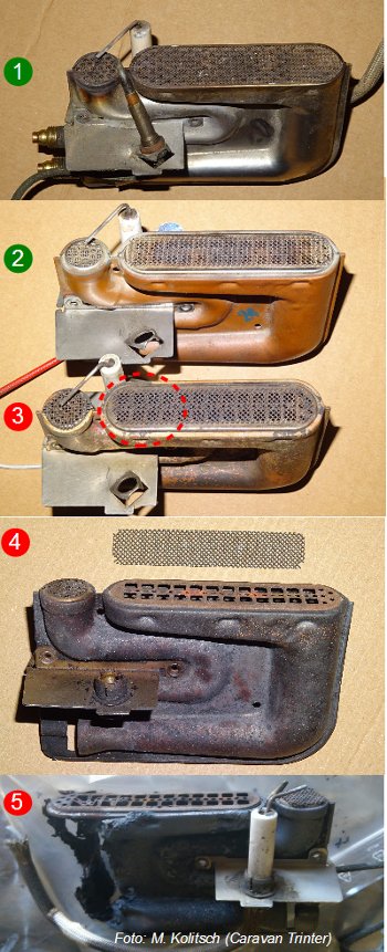 Bei den neueren Truma Heizungen der Modellreihe 3004/5004 sind die Brenner im Prinzip immer noch baugleich (und auch austauschbar, d.h. Ersatzteile entsprechen bis auf einen Detailunterschied* neuer Ausführung), jedoch wird dort statt Kupfer wieder Stahlblech eingesetzt... . *: Bei Brennern für 30mbar ist zusätzliche eine “3” eingeprägt, da sich das Lochbild unter dem Flammschutzgitter in der Lochung etwas unterscheidet...