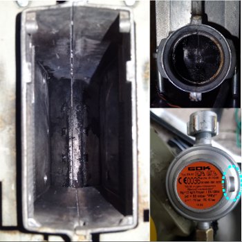 Die Bilder links zeigen 3 Brenner kurz vor dem Zerfall, wie im vorherigen Bild Brenner Nr. 3. Bei den beiden oberen ist das Flammschutzgitter auf der Seite zu Thermoelement und Zündkerze lose und die Flamme brennt bereits unterhalb seitlich raus. Bei dem unteren Bild ist das Flammschutzgitter mittig abgelöst und die Flamme brennt ebenso seitlich raus. Je nach Einstellung des Gasventils ist das mehr oder weniger deutlich erkennbar. Wenn die grosse Flamme abgestellt wird kann man unter Umständen auch zeitweise ein Flammenbild unterhalb vom Flammschutzgitter beobachten. Auch ein Glimmen von Ruß kann vorhanden sein, wo dann die rechteckigen Löcher im Brennerkörper erkennbar werden.... Betroffen davon sind übrigens vorwiegend Brenner die zwischen Ende 86 und 1993 produziert wurden. Danach hat Truma die Anzahl der Schweißpunkte vom Flammschutzgitter deutlich erhöht und bis heute so beibehalten.