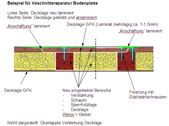 Die Reparatur der Bodenplatte erfolgt üblicherweise abschnittsweise von oben/innen, wobei die untere GFK-Decklage nicht entfernt wird. Nach der Beseitigung der schadhaften Teile und vollständiger Austrocknung können die Verstärkungen und neuer Schaum im ersten Arbeitsgang eingeklebt werden. Ggfls. Fläche von unten abstützen, damit die Fläche anschliessend wieder eben wird. Während der Aushärtung müssen die zu verklebenden Teile gegeneinander fixiert werden. Nach erfolgter Aushärtung kann dann die Sperrholzlage eingeklebt werden. Zum Abschluss folgt dann die Oberseite. Zum Fixieren von GFK-Bahnenware jeweils entsprechende Gewichte bereithalten. Vorteilhaft ist wenn geschraubt werden kann. Dies ist z.B. auch umlaufend möglich wenn die vorhandene Sperrholzlage, wie im Bild dargestellt, schräg angeschnitten wird. Die dargestellte “Anschäftung” stellt zum einen die volle Tragfähigkeit und im Bereich ohne Verstärkungen die Trittfestigkeit der Bodenplatte sicher. Bei einem flächigen Austausch der Bodenplatte ist auch eine Nut+Feder-Verbindung, oder der Einsatz von Lamellos möglich. Bei einem Neuaufbau der Bodenplatte kann auch vom werksseitigen Aufbau abgewichen werden. Hier bietet sich der Einsatz einer 12mm dicken Siebdruckplatte an, womit dann auf die obere GFK-Decklage verzichtet werden kann. Indivividuell ist, je nach Art des Schadens, der Anschluss an die Aussenwand zu lösen. Wichtig: Vor einer Reparatur lieber fragen, z.B. im Forum und sich kundig machen... Nicht vergessen die Forensuche zu nutzen, denn unter dem Begriff “Bodenplatte” gibt es einige lesenswerte Beiträge!