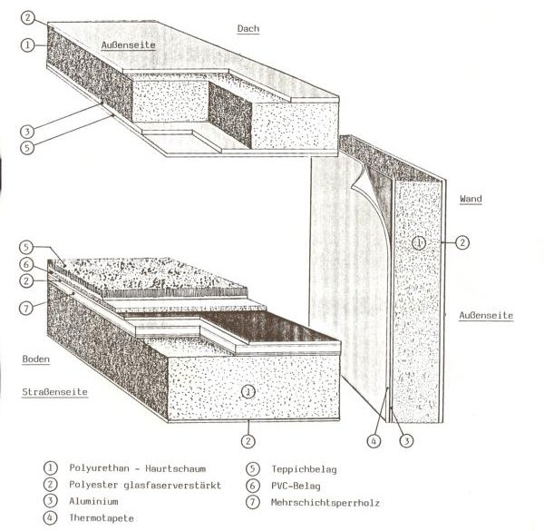 Die Dicke von Wand und Dach beträgt ca. 28-30 mm (25mm PU-Schaum + Decklagen) Die Dicke der Bodenplatte beträgt ca. 35/40mm (25/30mm PU-Schaum + 8mm Sperrholz + Decklagen), je nach Baujahr und Ausführung des Fahrzeugs. Lokale Verstärkungen wurden, teilweise sogar als Stahlprofile, entsprechend der Schaumstärke nach statischer Notwendigkeit eingebracht. Für die Ausbildung der Plattenstöße siehe Datei “Dichtigkeit Aufbau”, die im Forum heruntergeladen werden kann.