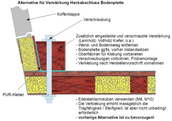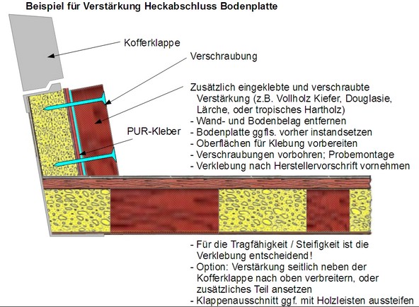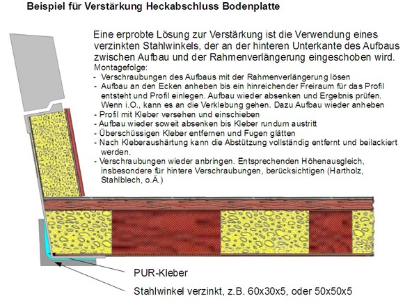 Ein bekanntes Problem ist das “Absacken” des hinteren Aufbauendes, das sich z.B. dadurch bemerkbar macht, dass sich die Kofferklappe nicht mehr “normal” Öffnen und Schliessen lässt und/oder die Dichtung der Klappe im mittleren Bereich beschädigt ist. Ursache ist hier vielfach eine angegriffene Verstärkung im hinteren Bereich der Bodenplatte. Die Schub- und Biegesteifigkeit der Bodenplatte ist dann lokal nicht mehr ausreichend und die Aufbauecken senken sich ggü. dem mittleren Bereich des Kofferklappenausschnitts entsprechend stark ab. Abhilfe schafft hier zum einen die Instandsetzung der Bodenplatte und zum anderen eine zusätzliche Verstärkung. Hierfür gibt es verschiedene Möglichkeiten. Ein Beispiel sehen sie hier: