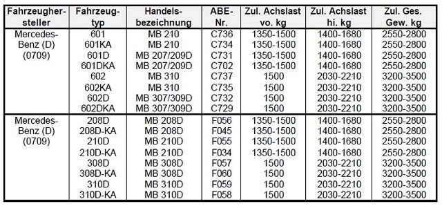 Wichtig: Bei den Bereifungen mit Querschnitt 75% reduziert sich geringfügig der Durchmesser und damit der Abrollumfang. Eine Änderung des Tachos ist jedoch nicht notwendig. Für Modelle vom Typ 611 gibt es eine zusätzliche Freigabe. Wer das Dokument benötigt kann dieses bei MB bekommen, oder uns eine Mail senden.